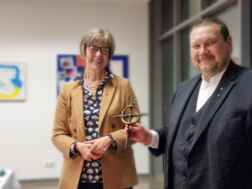 Aufgrund seiner besonderen Verdienste für die C.-v.-B.-Schule erhielt Dekan Uwe Rasp (rechts) bei seiner feierlichen Verabschiedung in der Bomhard Schule das „Bomhard-Kreuz“ von Regionalbischöfin Gisela Bornowski überreicht. Bei einem festlichen Essen wurde der stellvertretende Vorstandsvorsitzende von der Schulleitung, von Stiftungsräten, dem Geschäftsführer sowie dem Vorstandsvorsitzenden Fred Zeller verabschiedet. Zusammen mit dem Schulleiter OStD Alfred Lockl bildeten Zeller und Rasp den Stiftungsvorstand, der sich um die Belange der Schule und des Internats kümmert; hier hatte der Uffenheimer Dekan in den letzten Jahren immer aktiv mitgewirkt und es wurden sehr viele Bauprojekte angegangen. Nun scheidet er leider, da er Uffenheim als Dekan verlässt, aus dem Stiftungsvorstand aus.