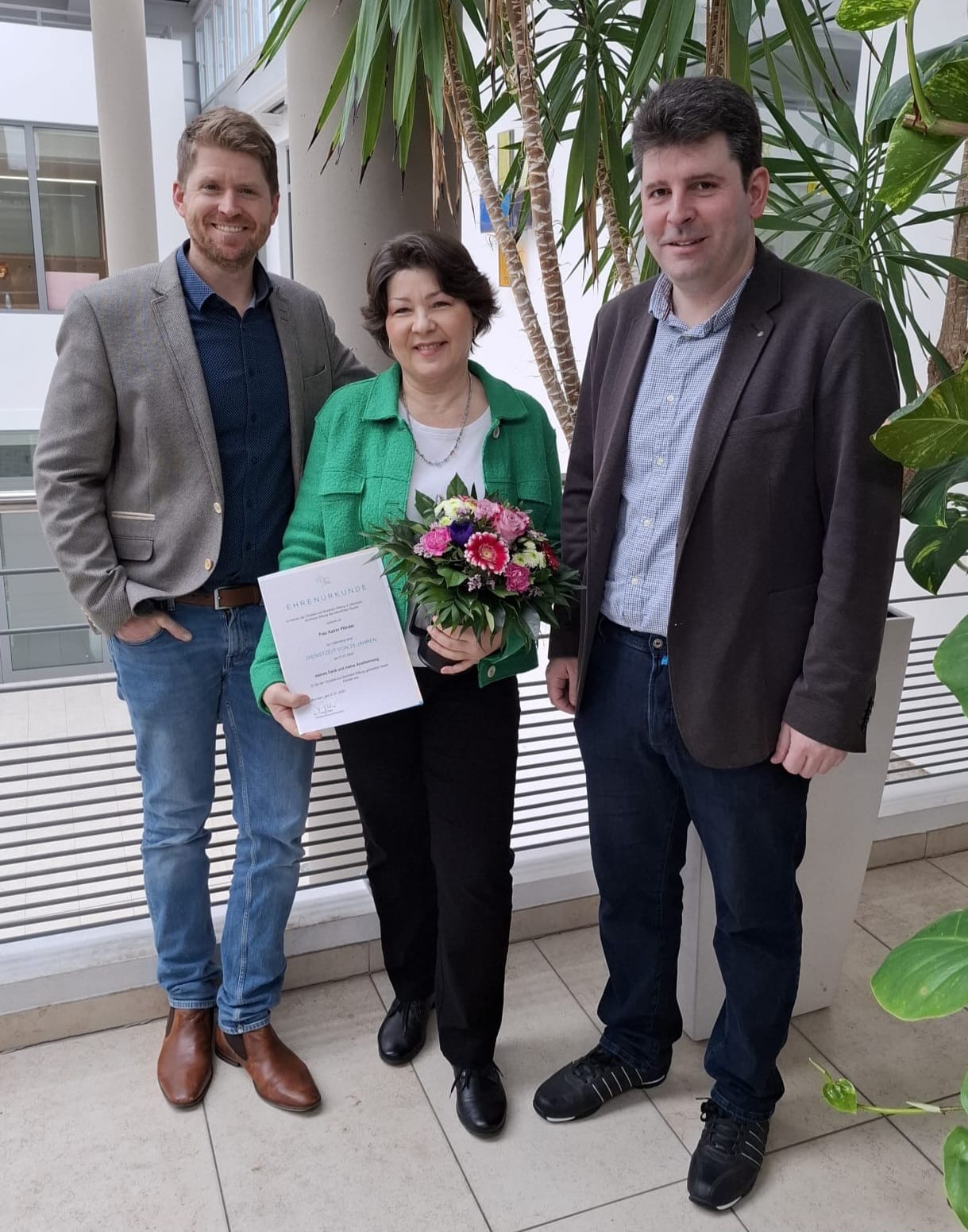 Einen besonderen Tag erlebte Katrin Pfänder Anfang des Jahres 2025. Sie wurde vom Gesamtschulleiter, OStR Philipp Specht und dem Geschäftsführer der Christian-von-Bomhard Stiftung, Christoph Kilian, für eine Dienstzeit von 25 Jahren geehrt.