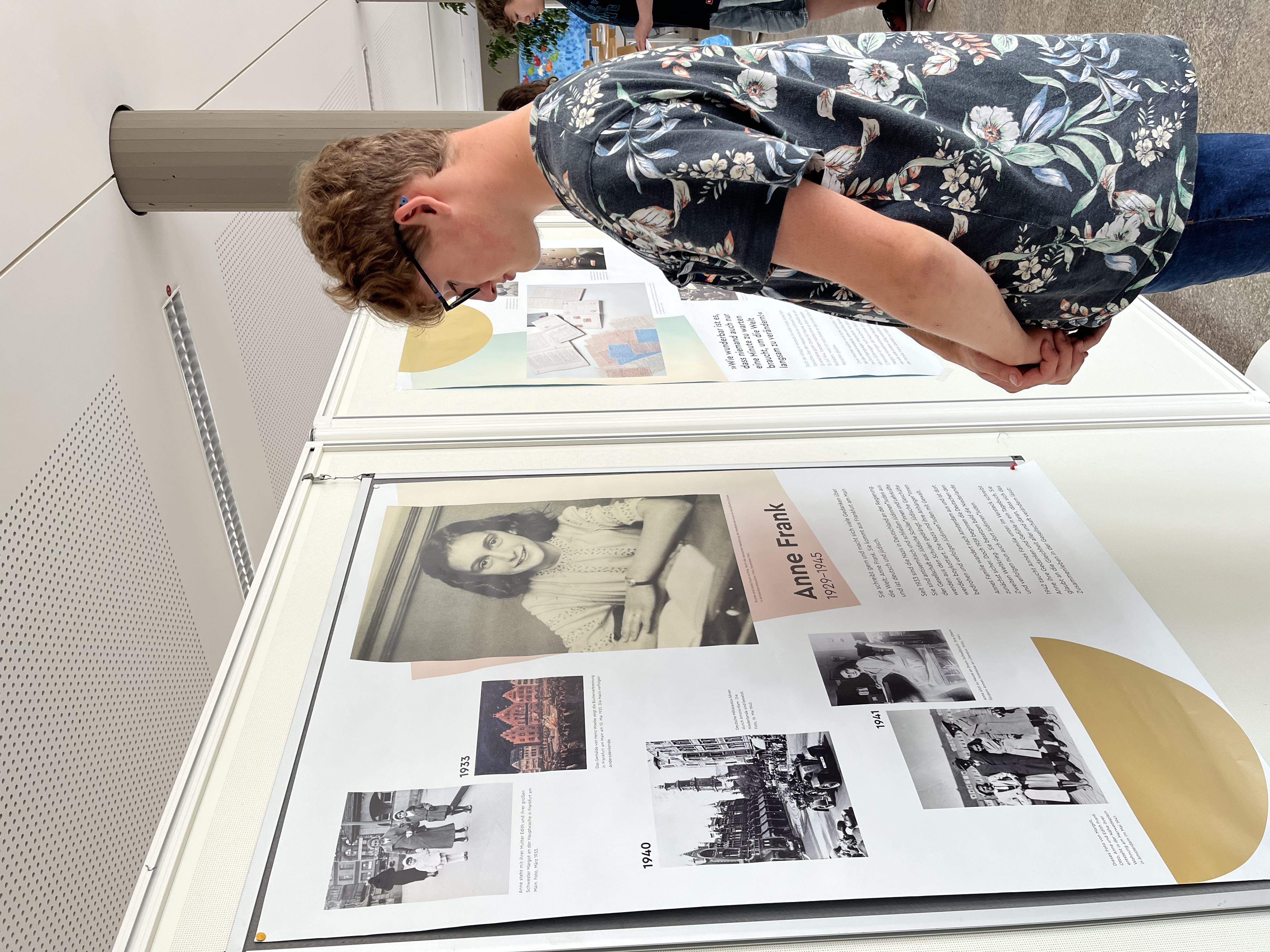 Darüber hinaus wurde ebenfalls die in der Ausstellung ausliegende Anne Frank Zeitung im Unterricht bearbeitet. Viele Schüler lernten so schon in der Unterstufe Anne Frank und ihr Schicksal kennen. Es ergaben sich auch reichlich Diskussionen über die Hintergründe der Zeit und viele der Schüler kamen so mit dem Thema Holocaust und Nationalsozialismus in Berührung. Neben Plakaten lag auch weiteres Infomaterial aus.