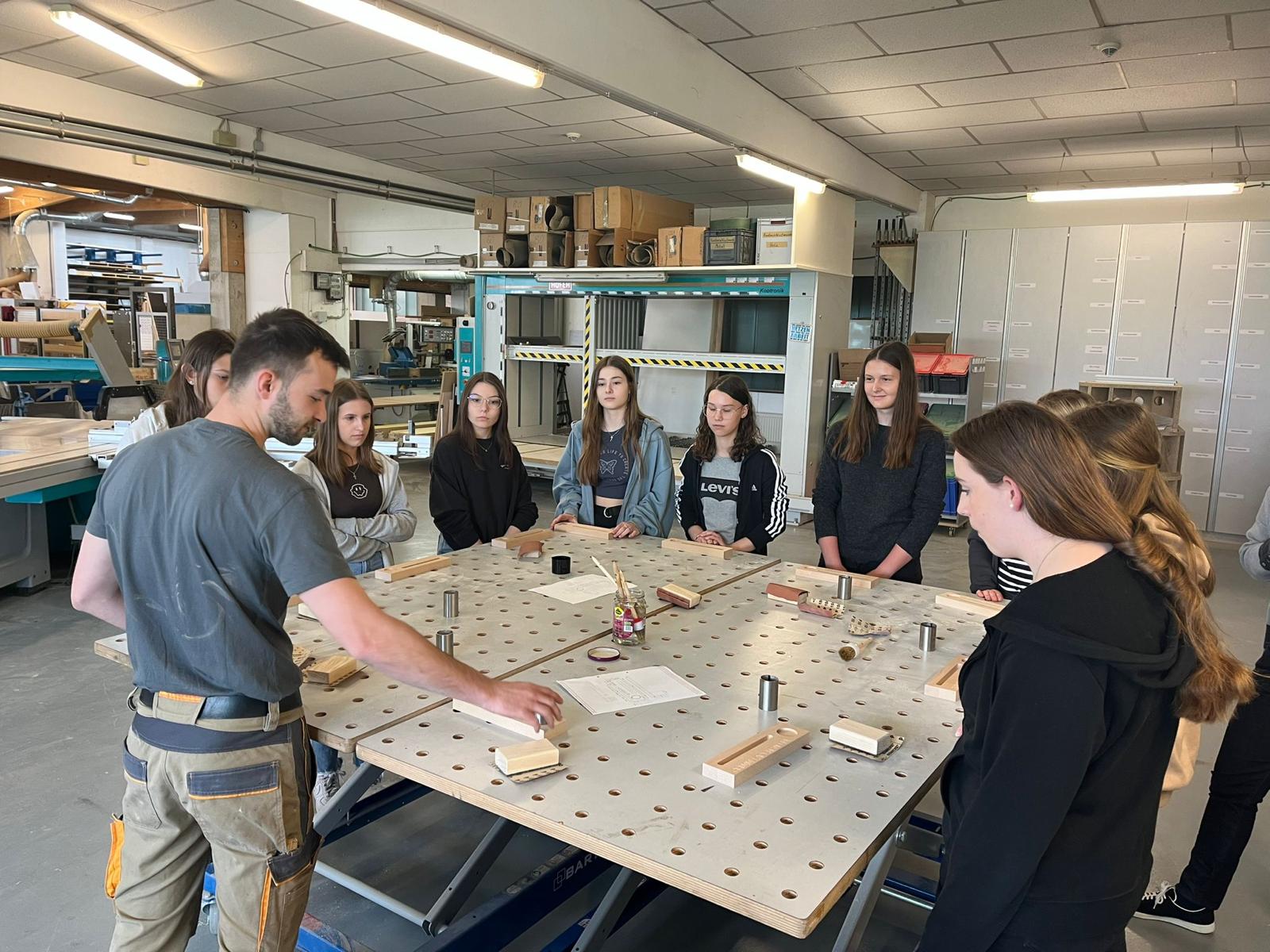 Unter dem Slogan „Deine Hände können mehr als scrollen und swipen“ startete die Klasse 9bR am Mittwoch, 11.05.2023 im Unternehmen Grimm Möbelwerkstätten GmbH in Ulsenheim in den Tag des Handwerks. Dieser wurde vor wenigen Monaten von der Handwerkskammer in Zusammenarbeit mit dem Kultusministerium initiiert und bietet den Jugendlichen die Chance, in die Welt des Handwerks einzutauchen, die Vielfalt der Tätigkeiten im realen Leben zu entdecken und "einfach mal zu machen". Zu Beginn des Workshops wurden die Schüler:innen herzlichst vom Inhaber Herrn Grimm sowie seinen Mitarbeitern Herr Schuh und Herr Schmitt begrüßt und in drei Gruppen eingeteilt. Anschließend durfte jede Gruppe im Wechsel das Planungsbüro, die Fertigung sowie die Verkaufsfläche besichtigen. Die Vielfältigkeit des Unternehmens und seiner Produkte wurde den Jugendlichen schnell klar, als sie von Herrn Grimm durch die unterschiedlichen Bereiche geführt wurden, welche neben privaten Feldern wie Küche, Bad oder Wohnzimmer auch den Gastronomiebereich beinhaltet. Nach Besichtigung der einzelnen Fertigungsbereiche durften die Schüler:innen selbst Handanlegen: schleifen, einölen und kleben hieß es, um sich mit viel Spaß und unter Hilfestellung der Azubis einen eigenen Schreibtisch-Organizer zu bauen. Auch das Planungsbüro hielt eine Überraschung bereit: Die Jugendlichen bekamen exklusive Einsichten in die Planungen zum Umbau der Bibliothek unserer Schule. Hier wurde anhand des realen Beispiels erklärt, wie aus einer Idee die zugehörige konkrete Planung wird und was es bei der Umsetzung alles zu beachten gibt. Zum Abschluss eines aufregenden und abwechslungsreichen kümmerte sich das Unternehmen Grimm auch um das körperliche Wohl seiner Gäste – die Feedbackrunde fand bei „normalen“ und vegetarischen Hotdogs und Limonade sowie Kaffee und Plätzchen statt.