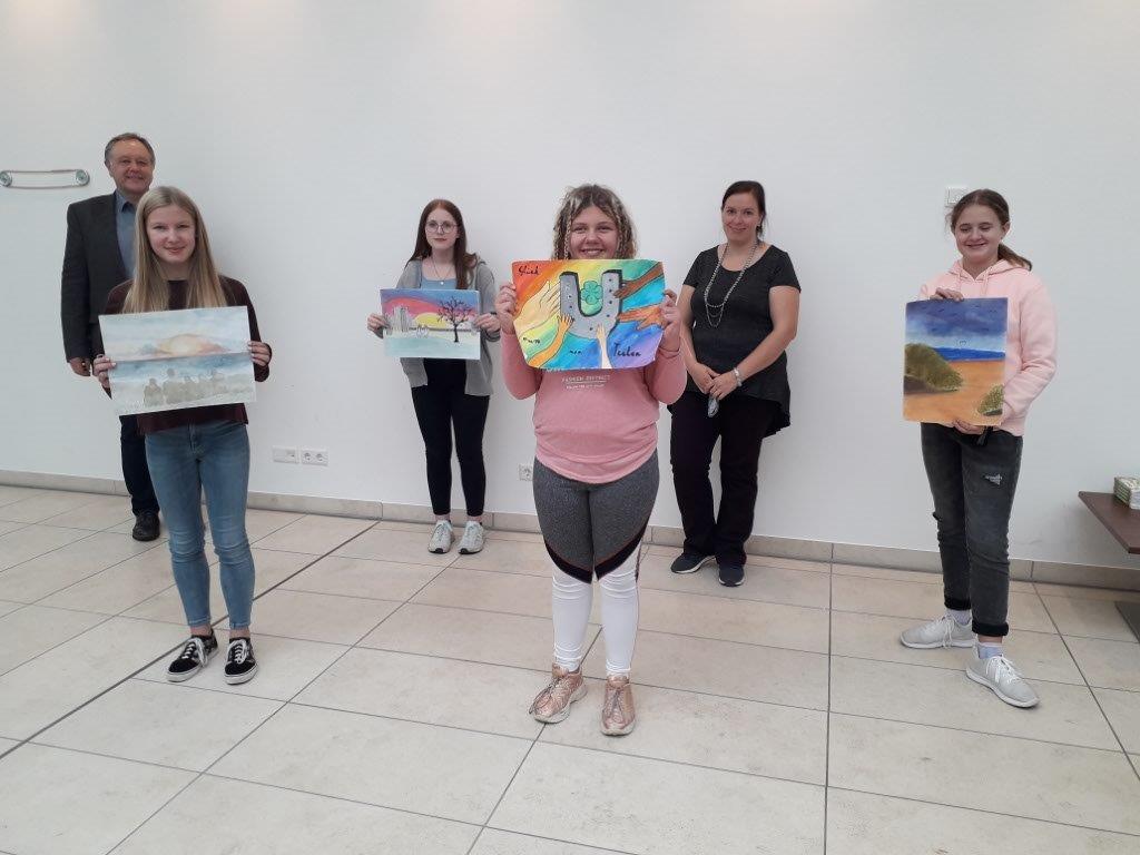 Im Online-Voting war die Jahrgangsstufe 5/6 besonders erfolgreich, denn hier konnten Hanna Neeser (1. Platz; zweite v. r.), Stefanie Breck (2. Platz) und Chiara Klose (3. Platz – dritte v. r.) alle Siegerplätze belegen. Aber ebenso Eva Weichelbaum (3. Platz in der Jahrgangsstufe 7/8; dritte v. l.) sowie Julia Fischer (1. Platz) und Leonie Röger (2. Platz – zweite v. l.) aus der Jahrgangsstufe 9/10 haben die Schule mit hochwertigen und sehr ästhetischen ansprechenden Arbeiten vertreten. Am Dienstag wurden nun - leider unter Corona-Bedingungen - die Schülerinnen in einer kleinen schulinternen Siegerehrung noch einmal für ihre hervorragenden Arbeiten gelobt. Außerdem erhielten sie zusätzlich zum Geldpreis der VR-Bank einen Gutschein vom Schulleiter OStD Alfred Lockl (ganz links) überreicht.