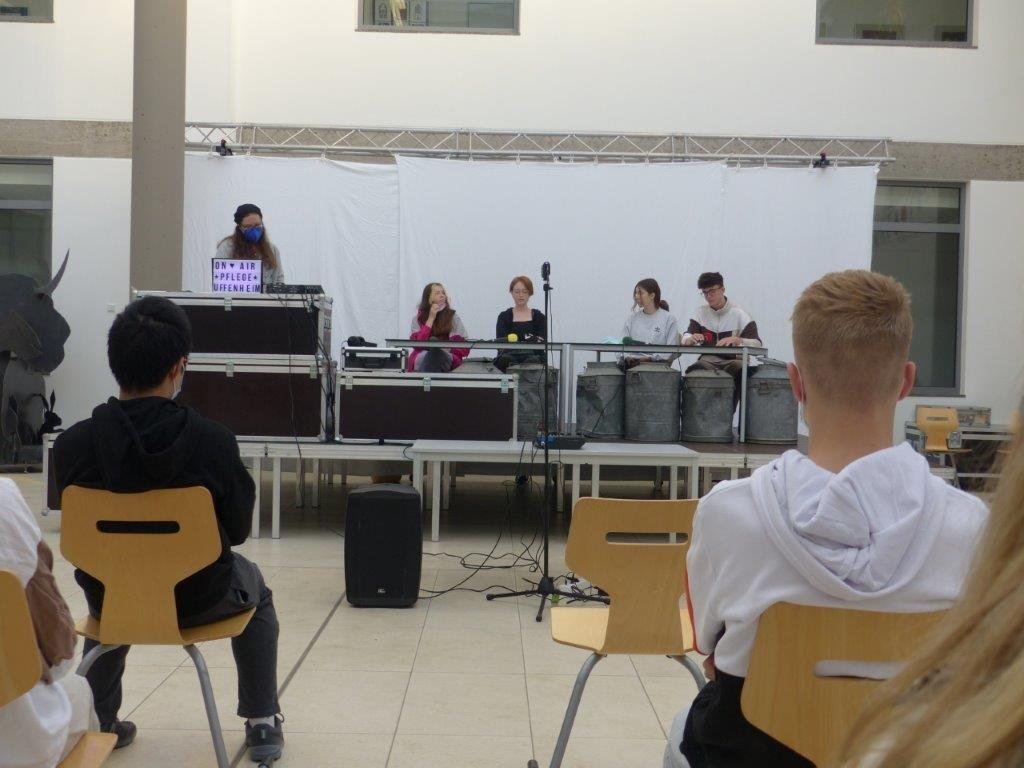 So konnte die Bandbreite des Pflege-Sektors gut aufgezeigt werden. Diese Aktion des Staatsministeriums für Gesundheit und Pflege, bei der die Bomhard Schule ausgewählt wurde, soll Werbung für Pflegeberufe und das neue Studium der Pflegewissenschaften machen. Daher war vom Ministerium die Kulturdesign-Agentur „Kunstdünger“ engagiert worden, um mir den Uffenheimer Schülern dieses Projekt durchzuführen. Nicht nur den Schauspielern bereitete die „Arbeit“ Spaß, auch den Zuschauern – unter ihnen auch der Gesamtschulleiter OStD Alfred Lockl – waren beeindruckt von der Emotionalität des Dargestellten (Interwies kombiniert mit verschieden Szenen). Ab nächste Woche ist dazu ein Podcast auf der Homepage zu finden.