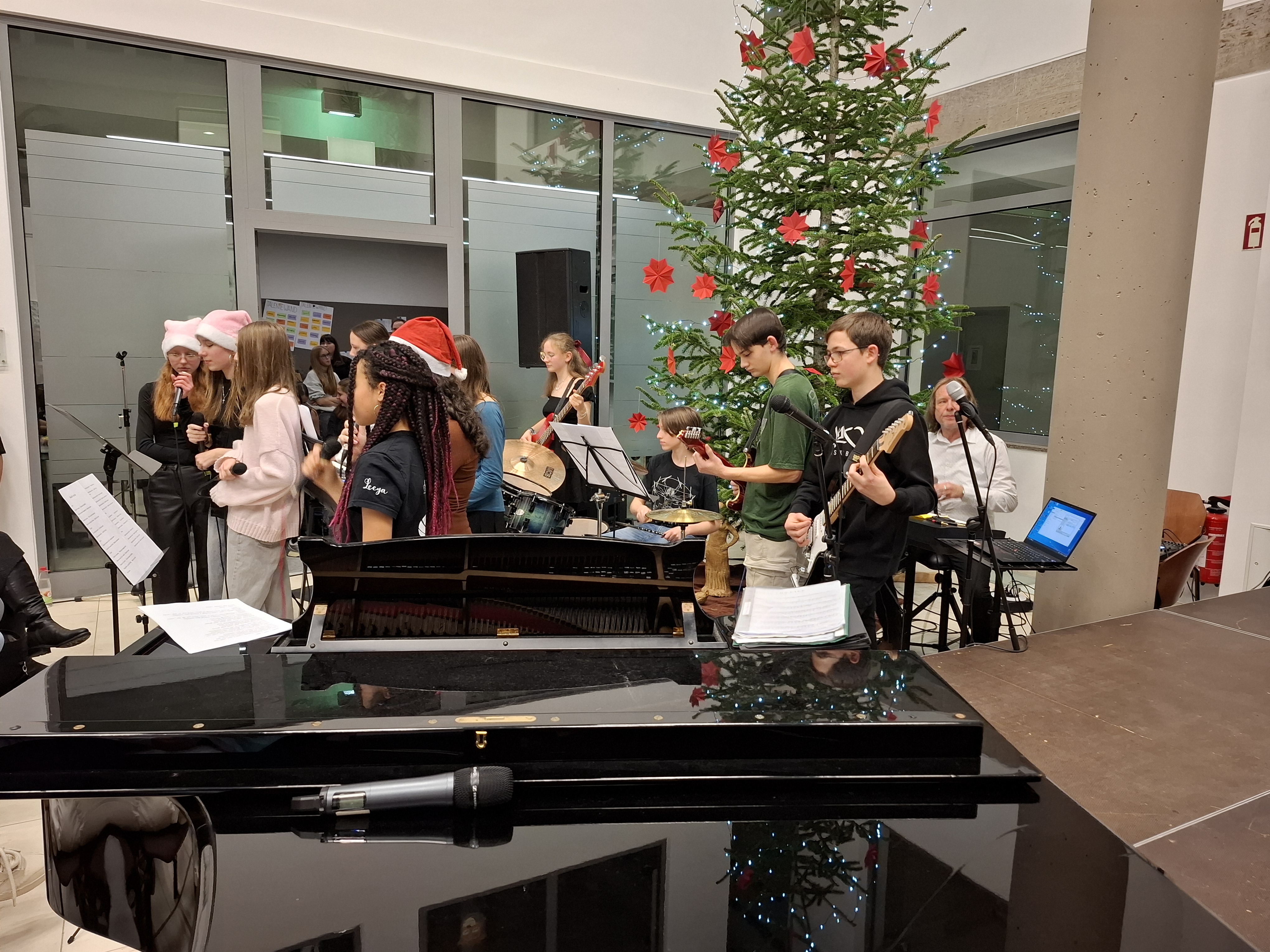 Frenetischen Beifall gab es danach für das Klavierstück „Maple leaf rag“, das Emilio Folz (Klasse Q 12) vortrug. Mit dem bestens bekannten ABBA-Song „Thank you for the music“ bewiesen Verena Präger (Klavier und Gesang) und Julia Fink (Gesang) – beide waren beim Konzert gleich mehrfach im Einsatz – ihre musikalische Extra-Klasse. Tänzerische Qualität konnten im Anschluss die mehreren hundert Konzertbesucher beim Tanz-Auftritt der Gruppe „Step up“ (unter der Leitung von Maria Schreiber) bewundern. Die vier Jugendlichen bewegten sich perfekt passend zu „Enemy“ (Imagine Dragons). Wie immer „heizte“ die Rockband von Thomas Rohler mit zwei Stücken kurz vor Ende der Veranstaltung noch einmal richtig ein. Nach einem kurzen Segen durch Pfarrerin Yvonne Kleinschroth und Religionslehrerin Prisca Stumpf sangen dann alle Aktiven auf der Bühne und fast ausnahmslos die gesamte Schulfamilie im Atrium „O du fröhliche“, was einen schönen Ausklang des besonders besinnlichen Abends darstellte.