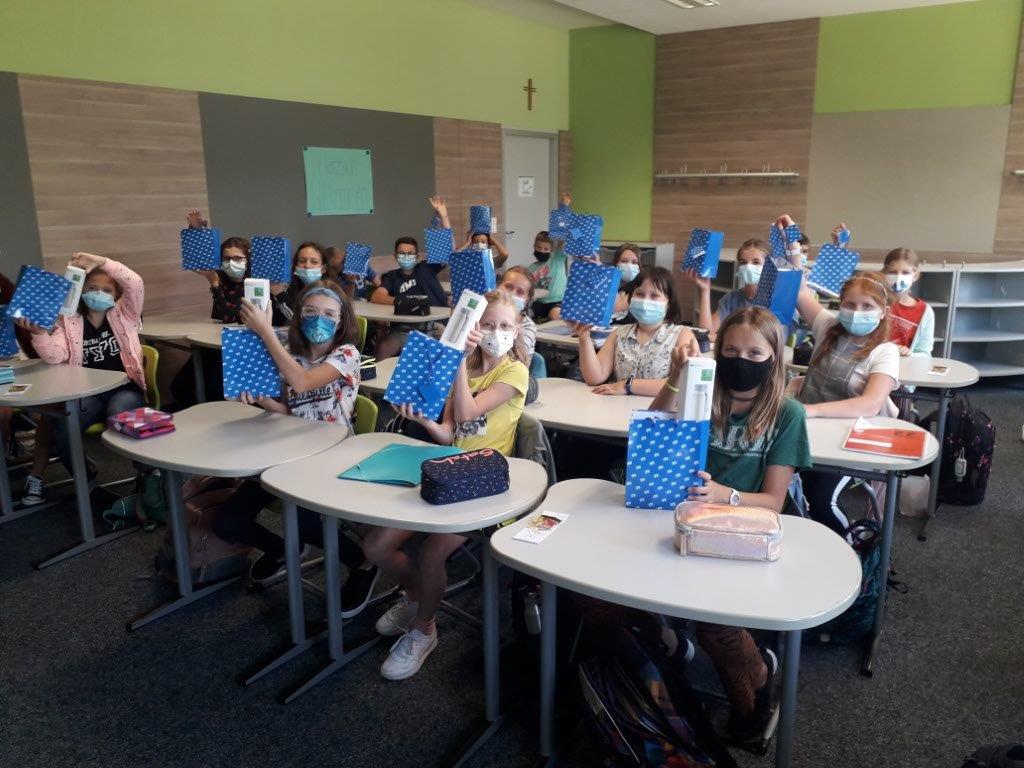 Auch die Tutoren waren – mit entsprechendem „Corona-Abstand“ - anwesend, sie kümmern sich zukünftig um die „Kleinen“ und helfen ihnen somit, sich leichter in der Anfangssituation – neues Gebäude, neue Fächer, neue Lehrer, … - zurecht zu finden und den Übergang an die weiterführende Schule „sanfter“ zu gestalten. Auch die FOS-Klassen mit dem Abteilungsleiter Philipp Specht wurden extra begrüßt. Wie immer gab es von Seiten der VR-Bank Uffenheim tolle Trinkflaschen, die in den Klassenzimmern dann verteilt wurden (siehe Foto). Hier kooperiert die C.-v.-B.-Schule bereits seit Jahren mit dem Elternbeiratsmitglied Helmut Schießl (Regionaldirektor der VR-Bank).