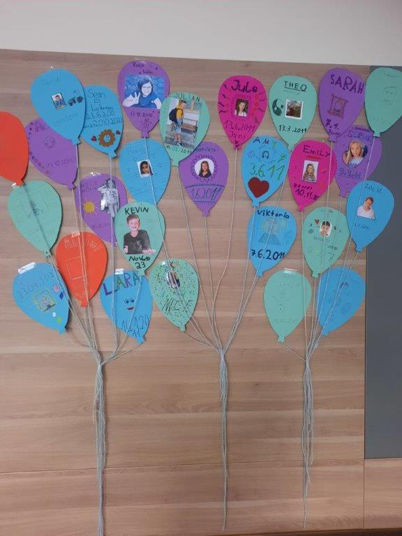 Fast jeden Nachmittag kann man eine der fünf sechsten Klassen oder eine der sechs fünften Klassen von Realschule bzw. Gymnasium im Schulhaus umherwuseln sehen. Bei den meisten Aktionen kümmern sich die Tutoren (Neunt- und Zehntklässler) darum, dass im Atrium gemeinsam nach Unterrichtsschluss gegessen wird; danach, als alle fertig waren, wurde aufgeräumt und jeder bastelte (siehe Foto) einen Luftballon für einen Geburtstagskalender fürs Klassenzimmer. Im Anschluss gingen dann noch alle in die Turnhalle, um dort Völkerball, Merkball und andere Fangspiele zu spielen. . Im Verlauf des Schuljahres wird es immer wieder Treffen geben, um z. B. zusammen Plätzchen zu backen, zu spielen oder – jahreszeitlich passend – Dinge zu basteln. Auch Fahrten werden, falls pandemiebedingt möglich, verstärkt durchgeführt.